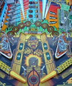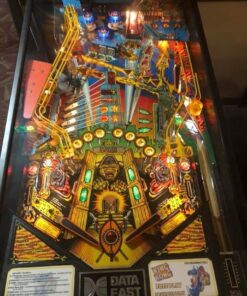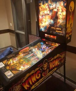 The playfield includes ramps, spinners, and targets that represent different aspects of the King Kong movie, such as the Empire State Building and Kong’s lair.